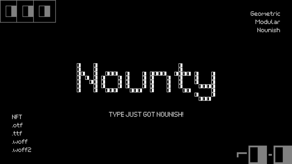 Nounty is a tribute to Nouns, Nouns is a community-owned brand with a treasury that funds amazing projects by amazing people. Nounty is a modular font that has the signature Nounish style blocks as modules. Nounty reserves no copyright and is under CC0.
